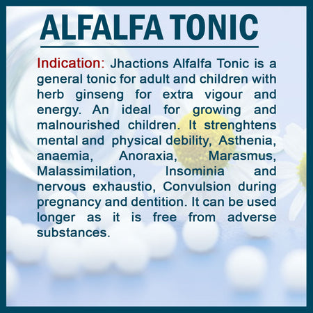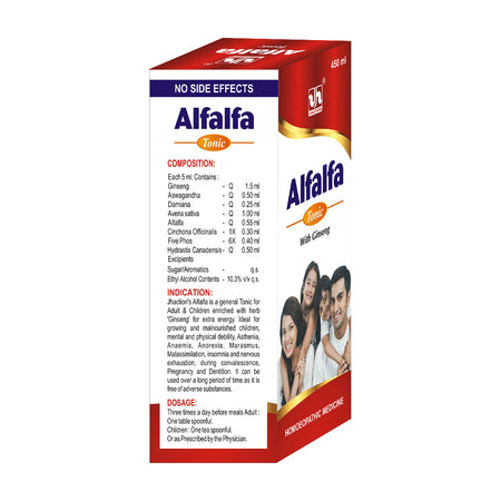 Nourish your mind and body with Jhactions Alfalfa Tonic 450.0 ml. This homoeopathic formulation, enriched with Ginseng, reduces weakness caused by irritable bowel syndrome. Ideal for students preparing for exams, it combats weakness, loss of appetite, and general debility. Perfect for those recovering from illness or surgery, as well as expectant mothers and those seeking to maintain a healthy weight.