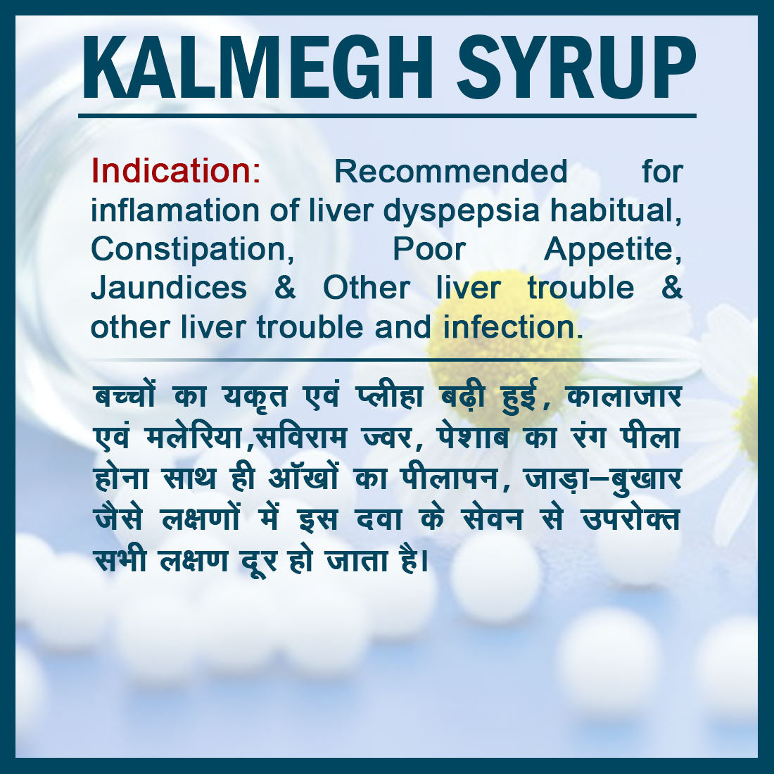 Jhactions Kalmegh Syrup is indicated for sluggish liver, loss of appetite, indigestion due to irregular function of liver, jaundice hepatic dysfunction, hepatomegaly and poor biliary secretion.