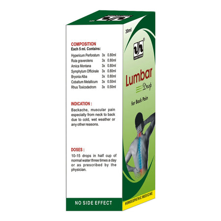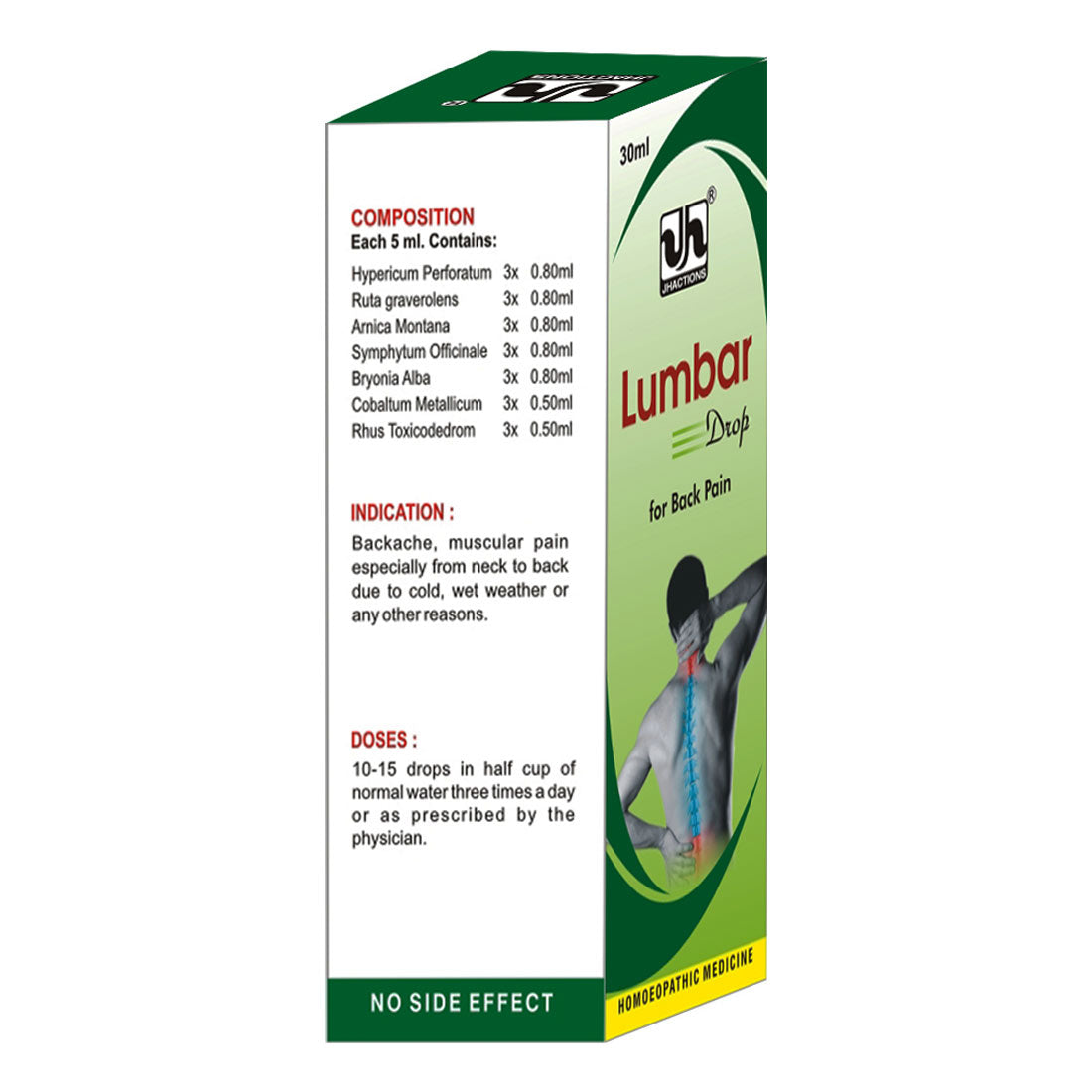 Relieve the pain and stiffness of your lower back with Lumbar Drop. This homeopathic medicine targets lumbar pain, including spondylitis, compression, and more. With Jhactions Lumbar Drop effective formula, you can experience relief and improved mobility in your lower back. Say goodbye to lumbago and hello to a more comfortable life.
