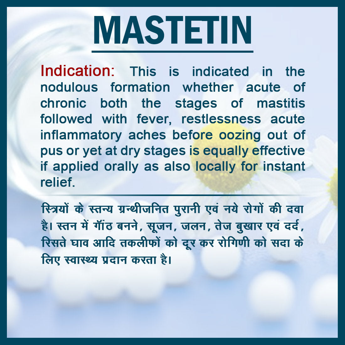 This is indicated in the nodules formation whether acute or chronic both the stages of mastitis followed with fever, pus or yet at dry stages is equally effective if applied orally as also locally for instant relief.