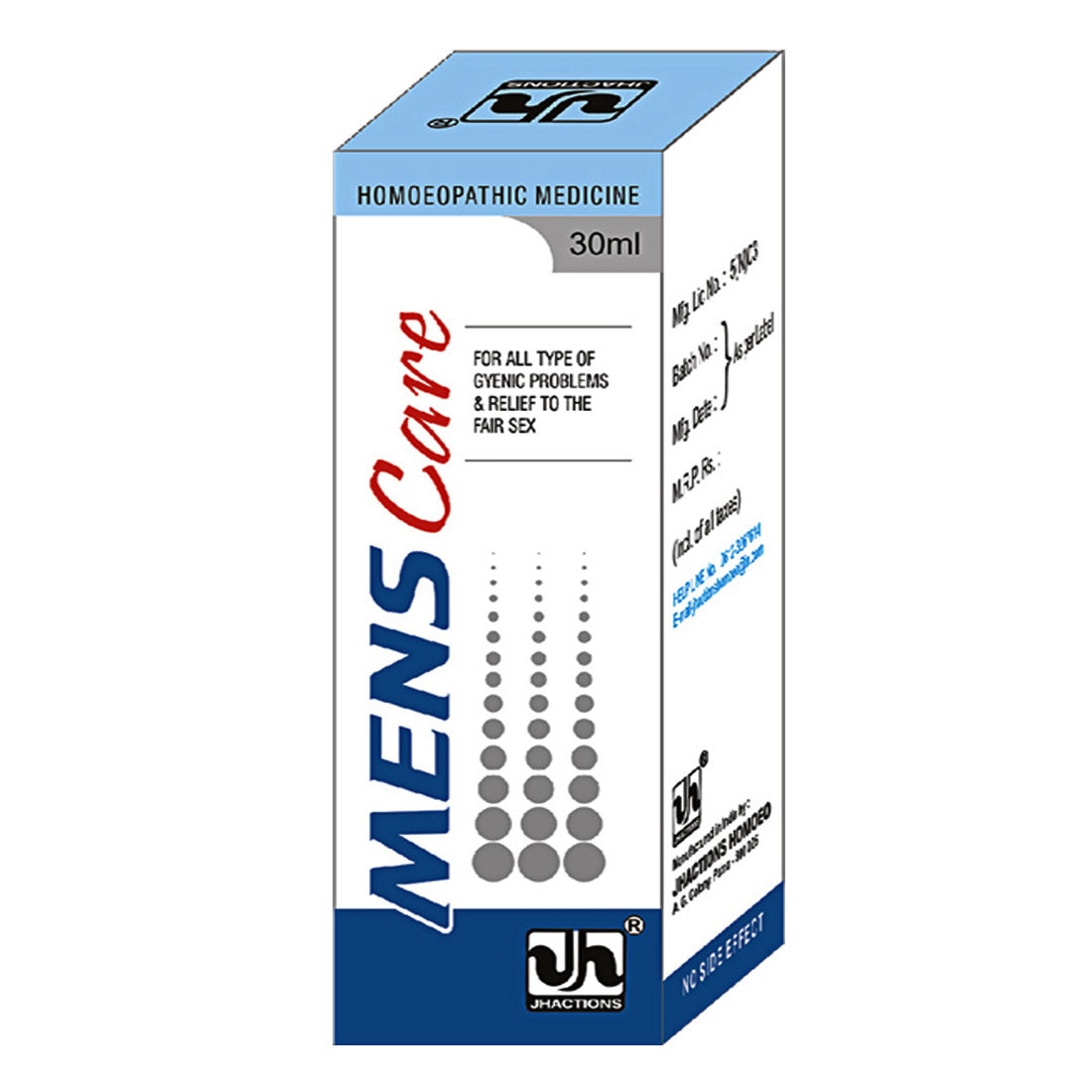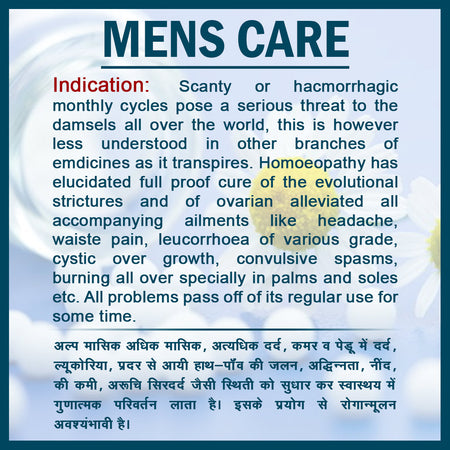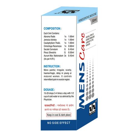 Experience relief and balance with Jhactions Mens Care Drop - a natural solution for menstrual irregularities. This gentle and effective formula helps regulate your cycle, and is specifically designed to ease Amenorrhoea, Dysmenorrhoea, and delayed or stopped menses. The perfect blend of safety and efficacy in a convenient 30.0 ml bottle.