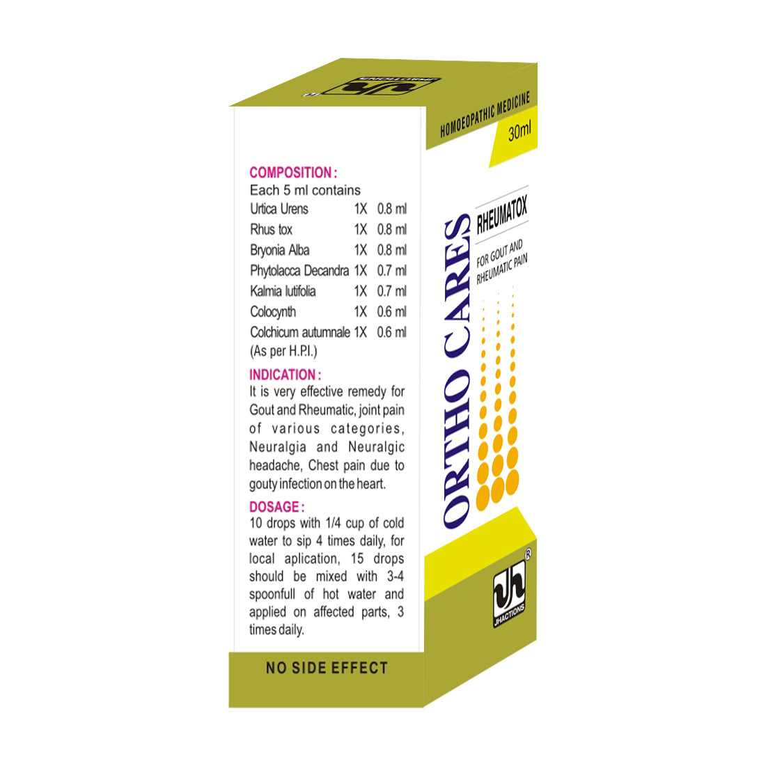 Dosage & Direction of Jhactions Ortho Cares 15-20 drops of the medicine should be mixed with 1/4 cup of hot water and sipped 4 times a day. So much medicine with two spoonful cold water should be applied locally for some time on the affected parts 3-4 times daily or as prescribed by the Physician.