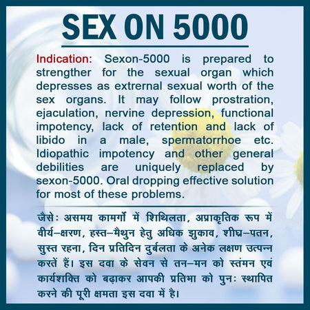 Experience enhanced sexual performance with Sex-On 5000 Drop. This scientifically-formulated homeopathic remedy helps address sexual disorders in men, promoting a more satisfying and enjoyable experience. With a 30.0 ml bottle, you'll have plenty for long-lasting results.