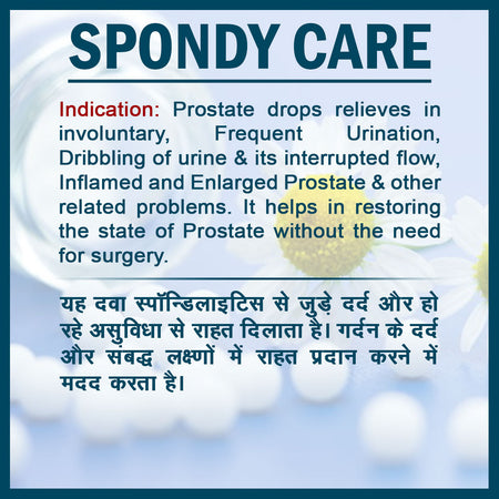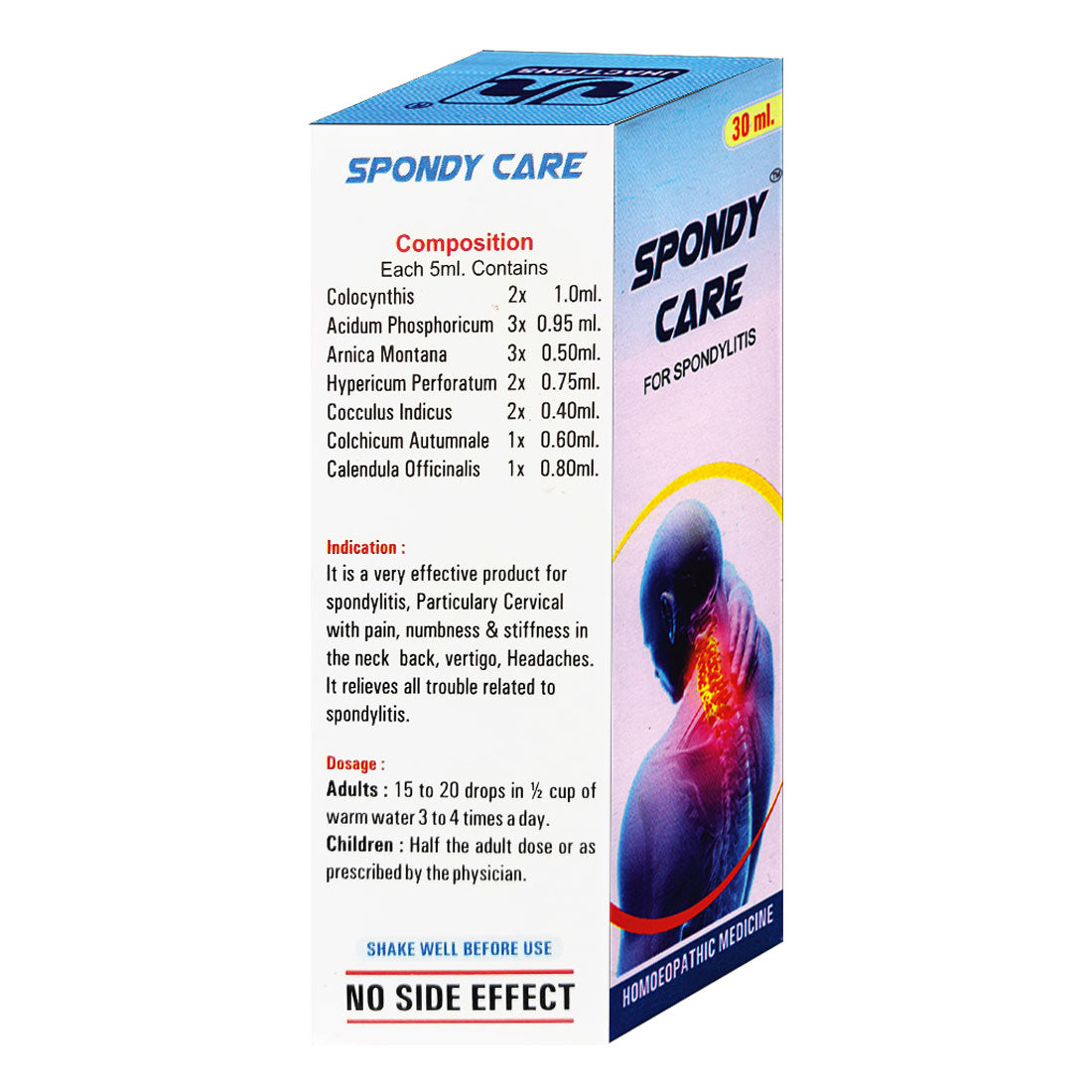Experience relief from spondylitis with Spondy Care Drop. This 30.0 ml homoeopathic remedy helps ease pain, stiffness, and inflammation associated with the disease. Say goodbye to joint discomfort and hello to a more comfortable, pain-free life.