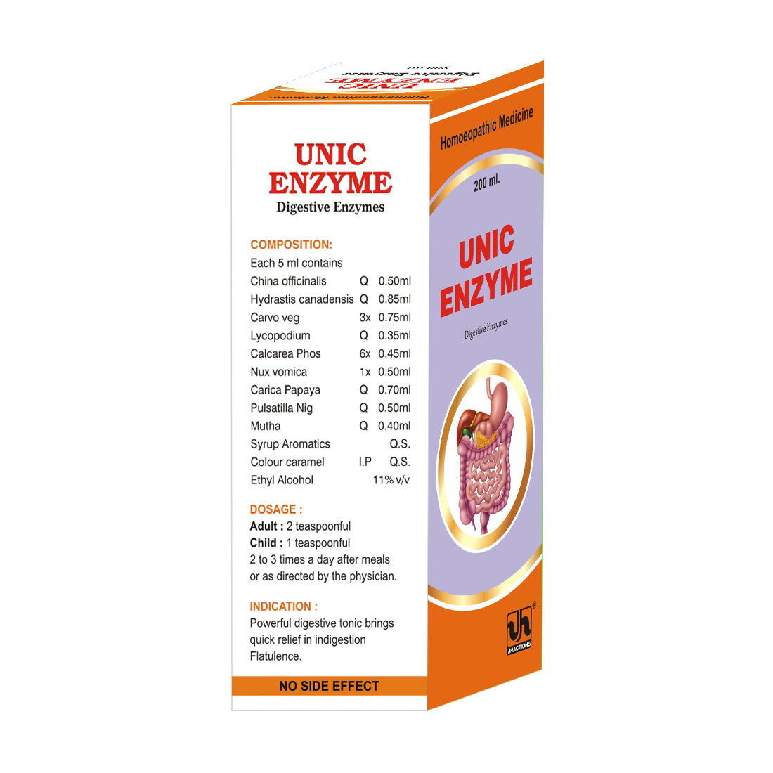 Jhactions Unic Enzyme is indicated in cases involving hyperacidity, eructation, heart burn, water brash, flatulence, indigestion, gastritis and colic.